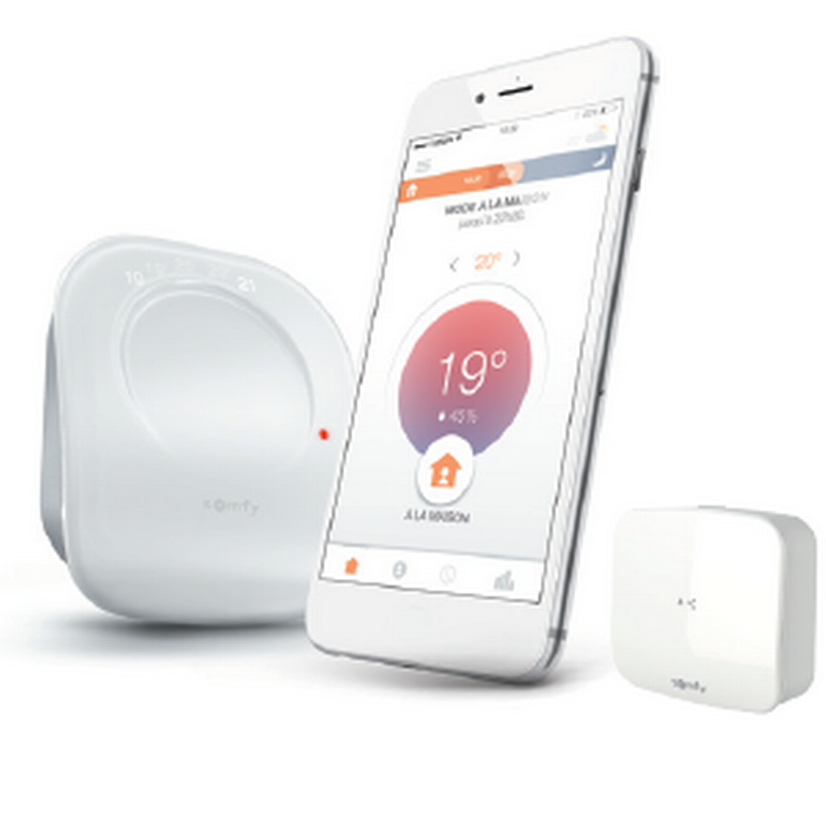 Avantajele gamei de termostate conectate Pentru că noțiunea de confort diferă de la utilizator la utilizator, Somfy a conceput un termostat care răspunde nevoilor de confort în funcție de tipul de locuință și de rutina utilizatorilor, reducând, în același timp, costurile de electricitate și gaz. Permite ajustarea temperaturii termostatului (interfață tactilă) și configurarea parametrilor cu ajutorul aplicației pentru smartphone (aplicație gratuită pentru Android și iOS).
