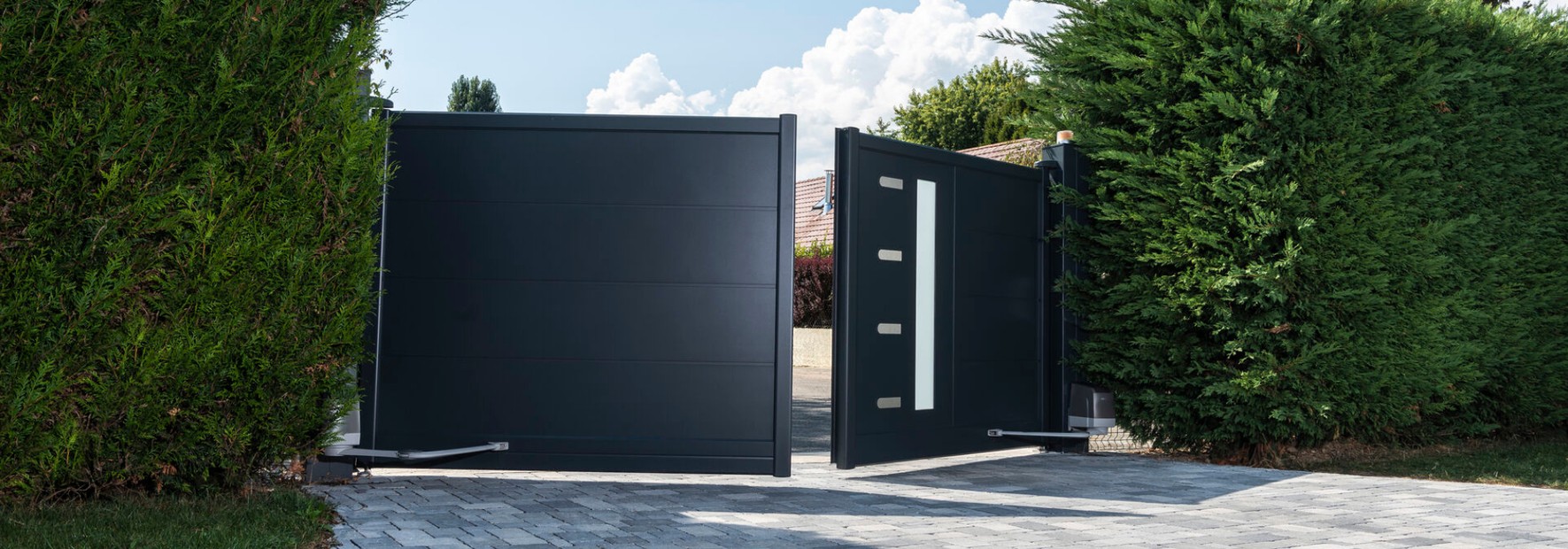 Compuse din două canaturi, acest tip de uși pot fi echipate cu diferite tipuri de motoare, în funcție de nevoile tale. Motoare cu brațe, motoare cilindrice sau integrate, dacă ești în căutarea unei soluții mai discrete.