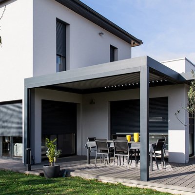 Acest model ofera echilibrul perfect între confort și stil. Vă permite să profitați la maximum de terasă pe tot parcursul anului, indiferent de vreme. Înclinând lamelele, puteți regla nivelurile de lumină și vă puteți proteja de căldură. Când sunt închise, vei fi la adăpost de soare, ploaie și vânt. Datorită circulației aerului, sub această pergolă nu este niciodată sufocant. Pot fi mai scumpe, dar pergolele bioclimatice sunt deosebit de rezistente la variațiile de temperatură și au o durată de viață extrem de lungă.